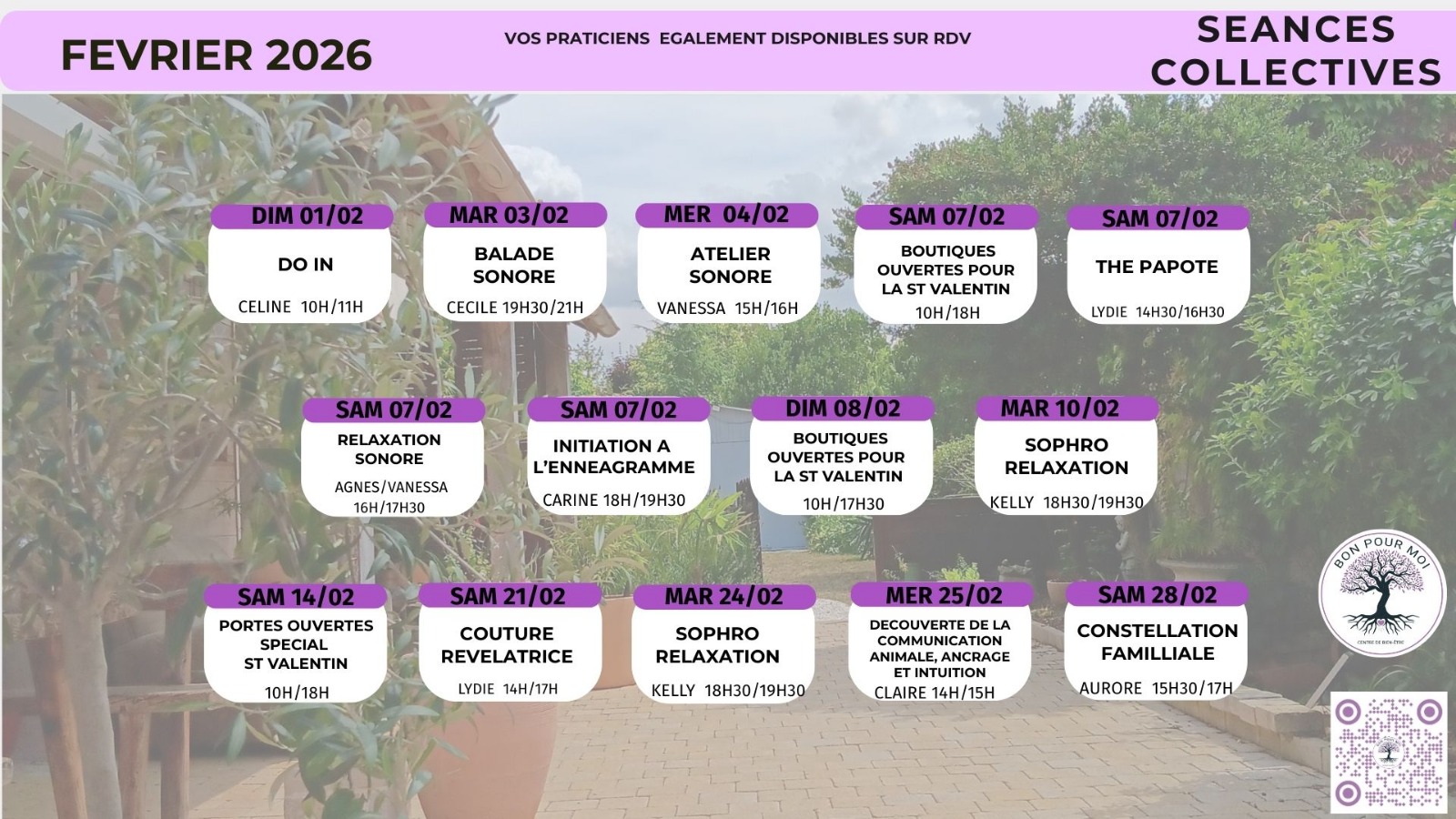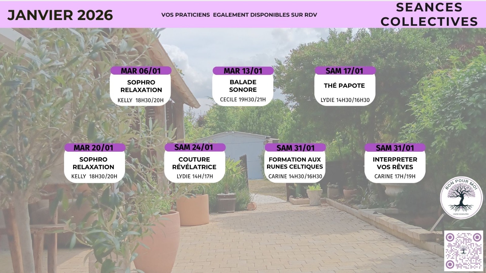 Venez assister à nos évènements réguliers pour une parenthèse bien-être régulière ou ponctuelle.